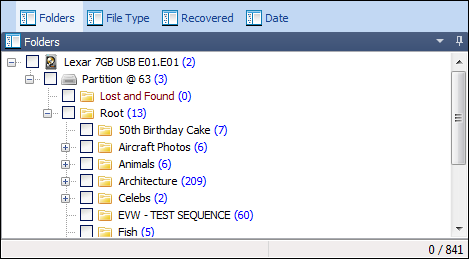 The Folders view shows all files and folders on the examined drive. The “Root” folder contains the existing folder and file structure on the drive. Deleted files and folders are located inside the Root folder and should appear in their original location prior to delete. Lost and Orphaned files are placed in their own folders under the partition in which they were found.